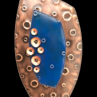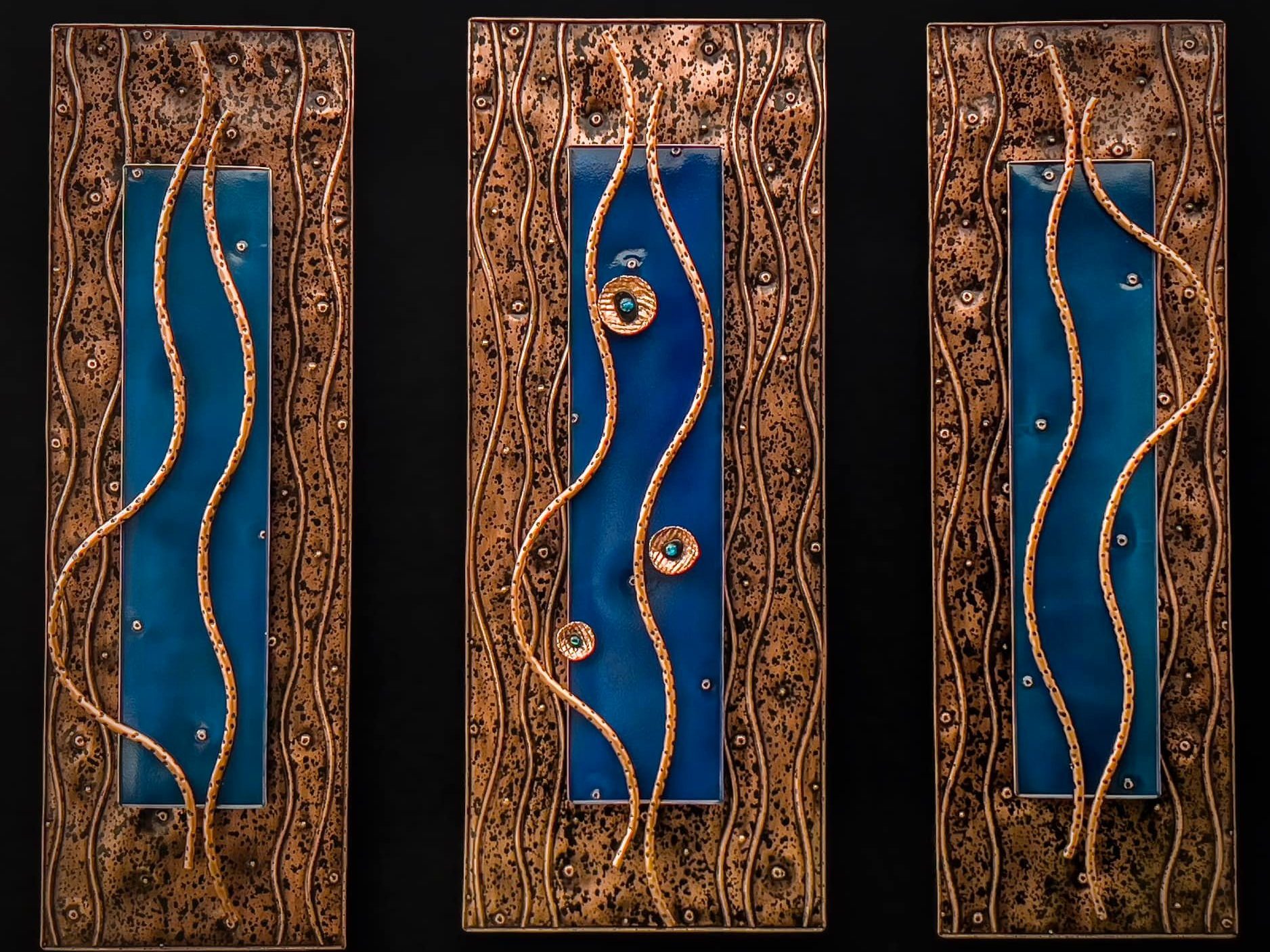 The artwork is non-objective abstract, with emphasis on line, texture, and color. The processes used to create the variations of copper include: repousse, chasing, hand tooling, torching, and acid patina. Finished pieces consist of a variety of tactile, visual textures and are designed as 3 dimensional wall sculptures.